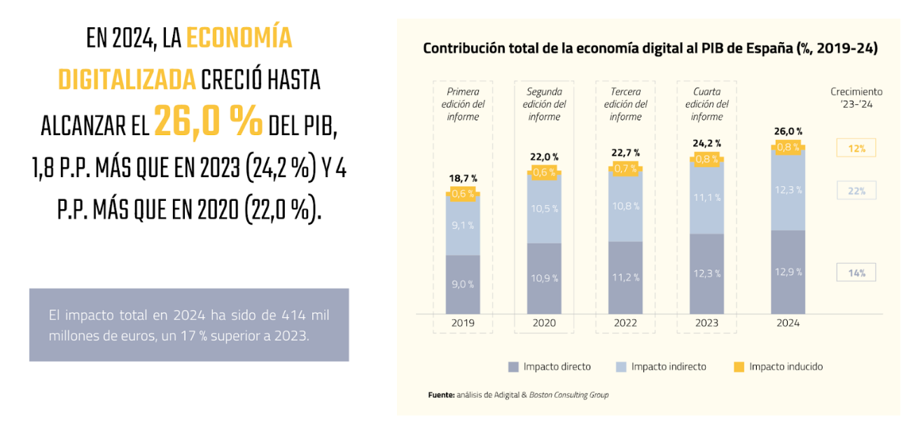El informe revela que, en 2024, la economía digital representó el 26 % del PIB de España, alcanzando los 414 millardos € (un 17 % más que el año anterior).
