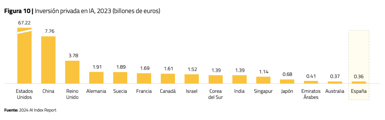 «Nos hemos posicionado como uno de los países líderes en adopción de IA entre las empresas, superando la media europea, con un 9,3 % de compañías que ya la integran en sus procesos», señala el informe. Sin embargo, existe una necesidad urgente de reforzar los recursos financieros destinados a la inversión en IA.